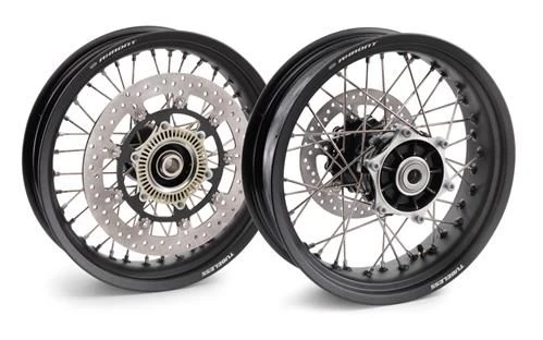 Complete Husqvarna wielenset. Deze stijlvolle en lichte wielenset geven een totaal andere look aan de motor. De wielenset wordt compleet geleverd inclusief voor- en achterremschijf, ABS-sensor en montagemateriaal.